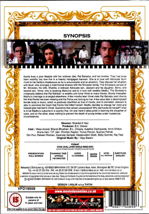 SUMMARY: Kavita lives a poor lifestyle with her widower dad, Rai Bahadur, and her brother. They had once been wealthy, but now live in a heavily mortgaged mansion. She is in love with Advocate Sunil much to her family’s displeasure as he is unsuccessful and an alcoholic. They discuss her situation with Murli, who arranges a matrimonial alliance with the Srivastav family. The Srivastavs consist of Mr. Srivastav, his wife, Shobha; a widower Advocate son, Jaswant and his daughter, Binny; and second son, Vimal, who is studying Medicine and is in love with wealthy Madhu. The Srivastav’s mistakenly believe that Rai Bahadur is wealthy and force Vimal to marry Kavita. Shortly thereafter Madhu’s marriage is arranged elsewhere. A few months later Vimal visits Rai Bahadur and informs him that Kavita has been missing and the Police are looking for her. A few days later a decomposed female body is found, which is positively identified as that of Kavita, and is cremated. Jaswant is able to convince the Court that Kavita had killed herself. Madhu decides to change her mind and instead gets married to Vimal. Questions that remain unanswered include why did Kavita kill herself, and what is to be Madhu’s outcome in a country that on one hand takes pride in banning slaughter of cows, and on the other does nothing to prevent death of young brides under mysterious circumstances.