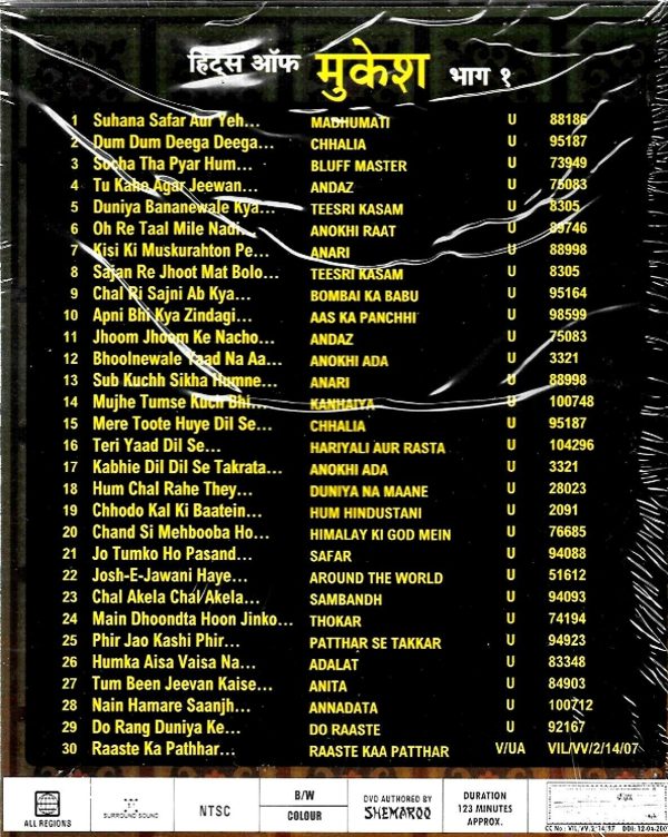 HITS OF MUKESH VOL.1 – SUHANA SAFAR AUR YEH MAUSAM -30 VIDEO SONGS BOLLYWOOD DVD