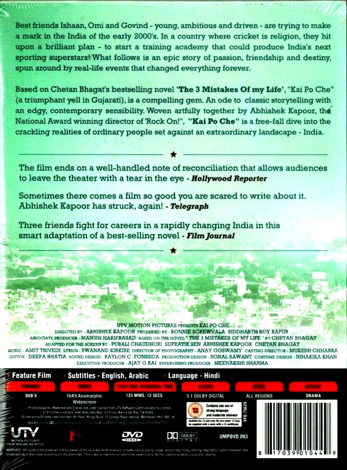 KAI PO CHE – SUSHANT SINGH RAJPOOT, AMRITA PURI BOLLYWOOD DVD – ENGLISH SUBS