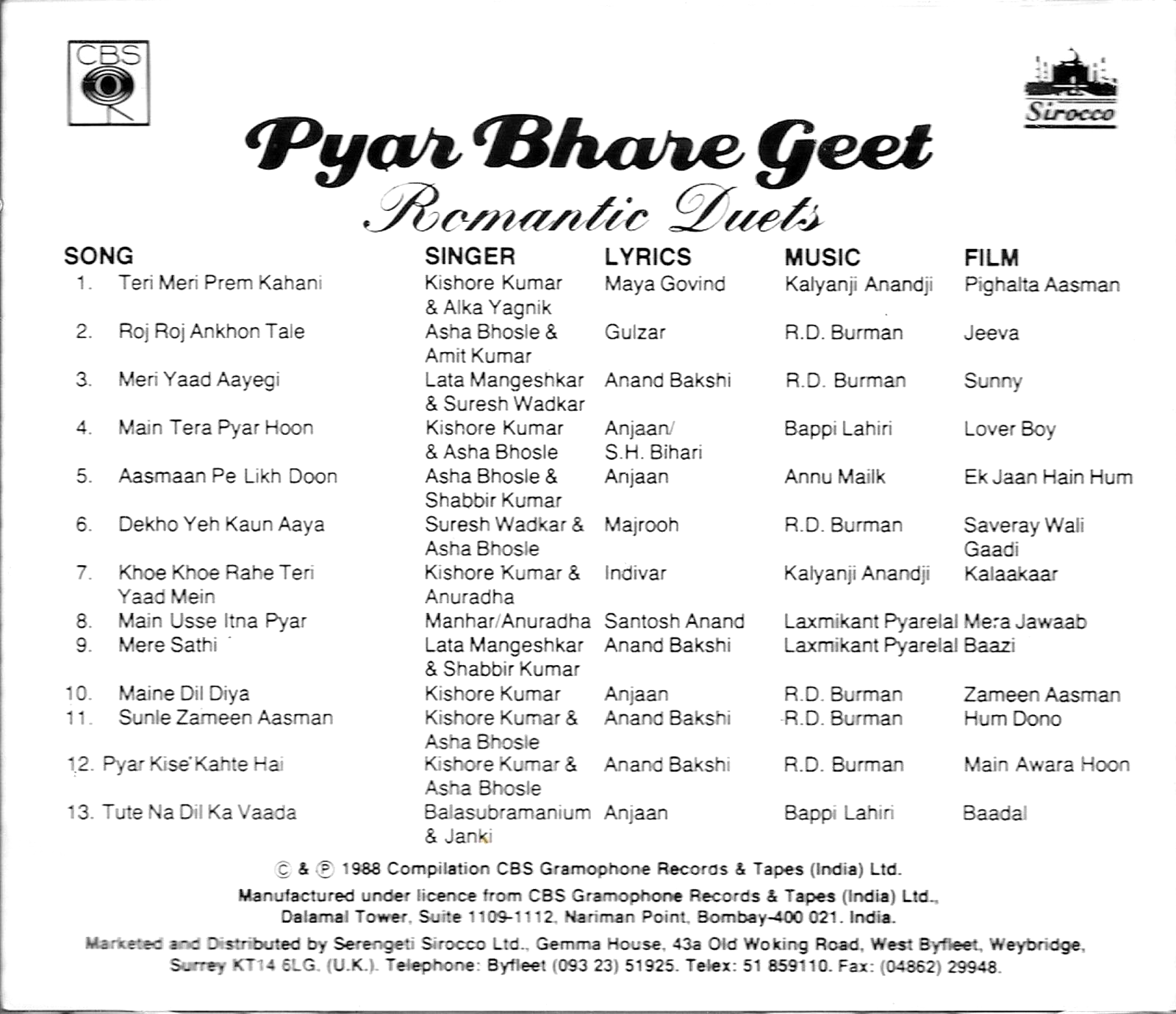 Be the first to review “PYAR BHARE GEET – ROMANTIC DUETS – I LOVE YOU – BRAND NEW ORIGINAL SIROCCO CD –” Cancel reply