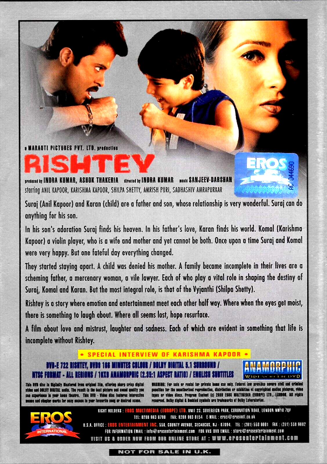 RISHTEY – ANIL KAPOOR, KARISHMA KAPOOR – NEW BOLLYWOOD DVD -ENGLISH SUBTITLES