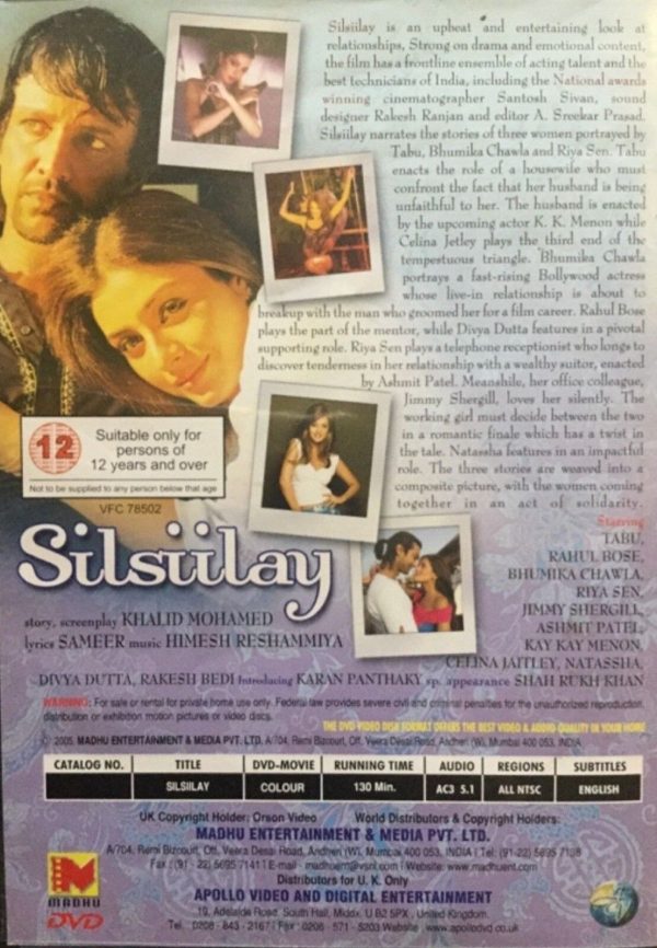 Be the first to review “SILSIILAY – SHAHRUKH KHAN. TABU – NEW APOLLO BOLLYWOOD DVD – ENGLISH SUBTITLES” Cancel reply